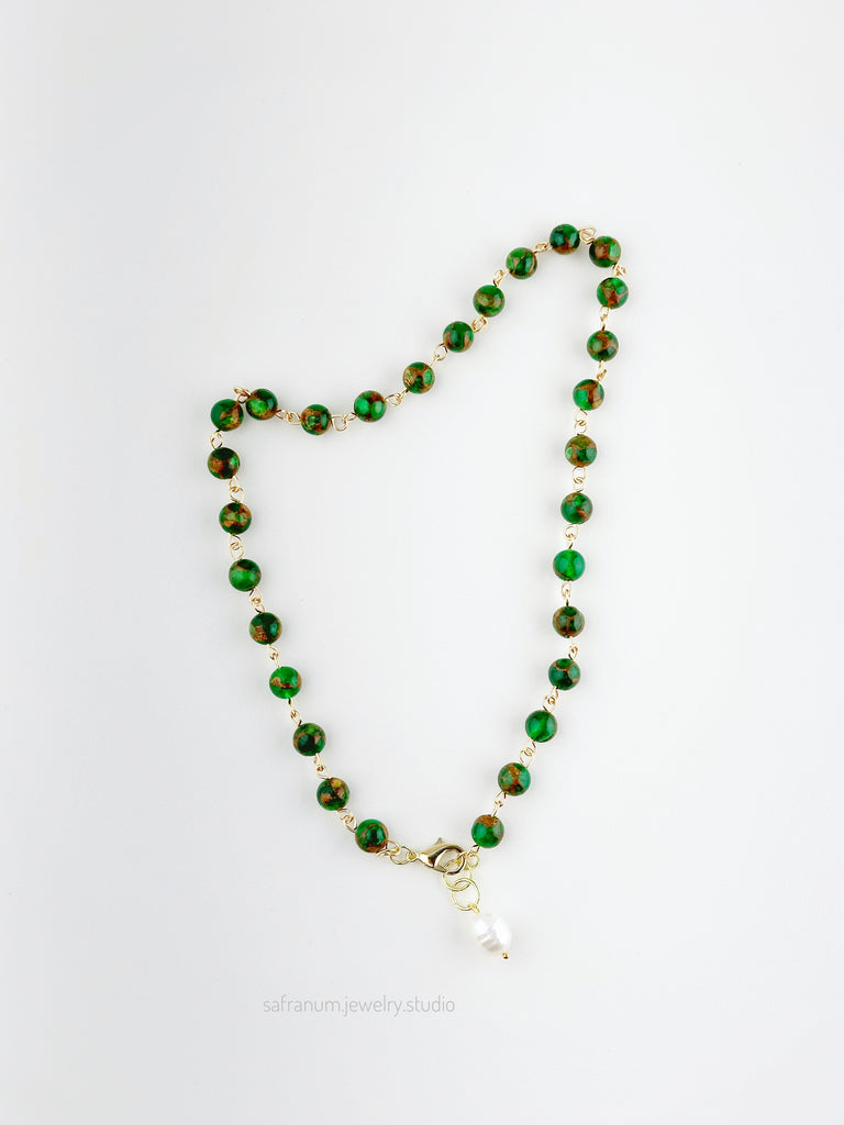 Ivy is an evergreen vine that stays fresh and green all year round. The creation of this handmade necklace sprung from this idea. Made of rich deep green cloisonne stone with a beautiful pattern of sand and gold in each bead. A truly remarkable gift befitting the season.